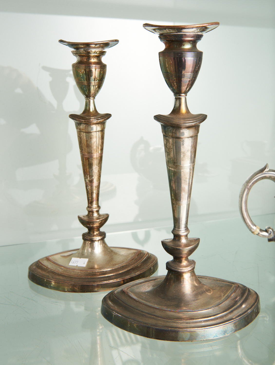 A PAIR OF SHEFFIELD PLATE TAPERED CANDLESTICKS, LEONARD JOEL LOCAL DELIVERY SIZE: SMALL (29 CM H), LEONARD JOEL LOCAL DELIVERY SIZE: SMALL