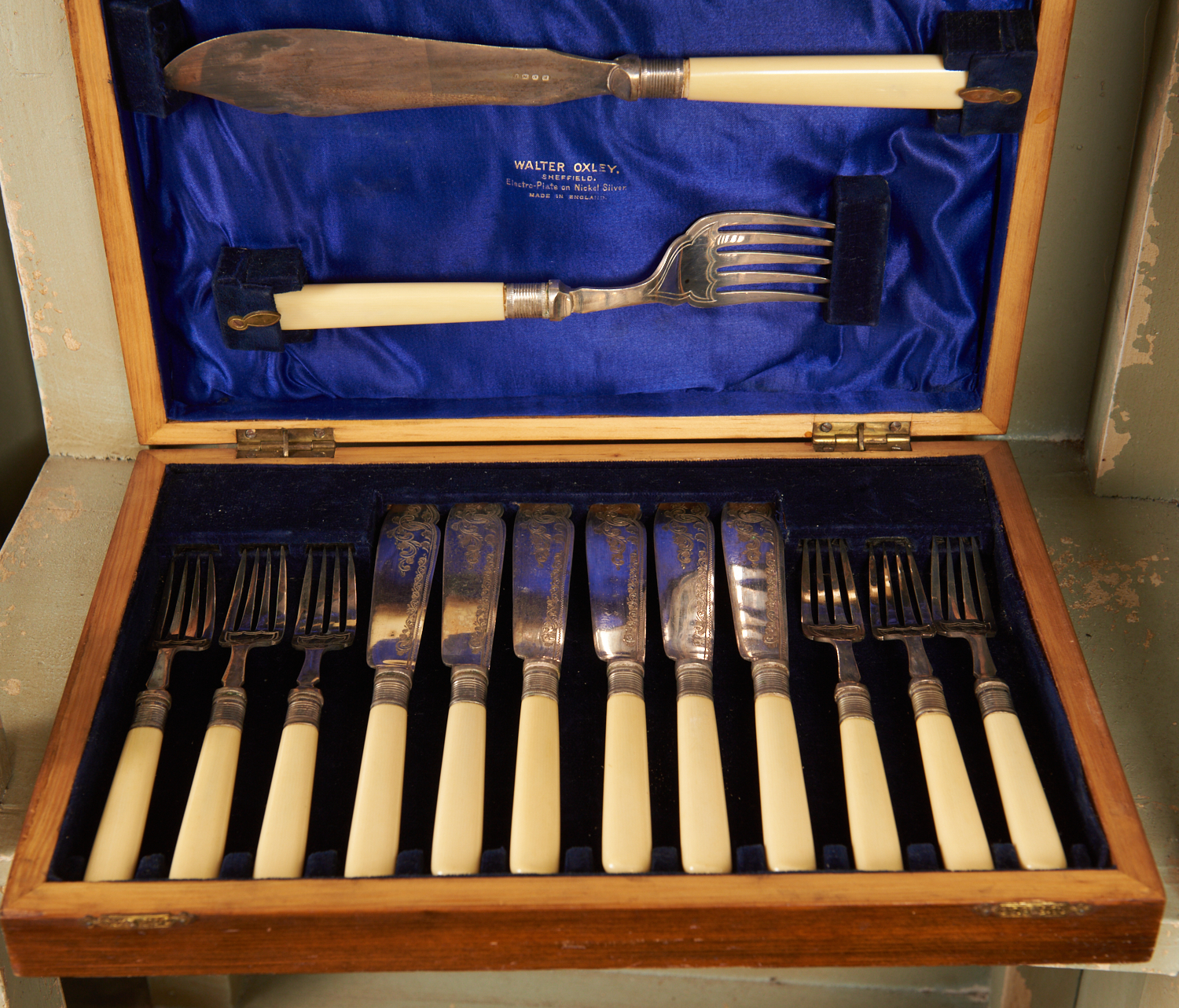 A BOXED SET OF FISH KNIVES AND FORKS WITH SERVERS, BONE HANDLED AND SILVER STERLING COLLARS, MARKED WALTER OXLEY, SHEFFIELD. THE BOX 6CM x 34CM x 25CM, LEONARD JOEL LOCAL DELIVERY SIZE: SMALL