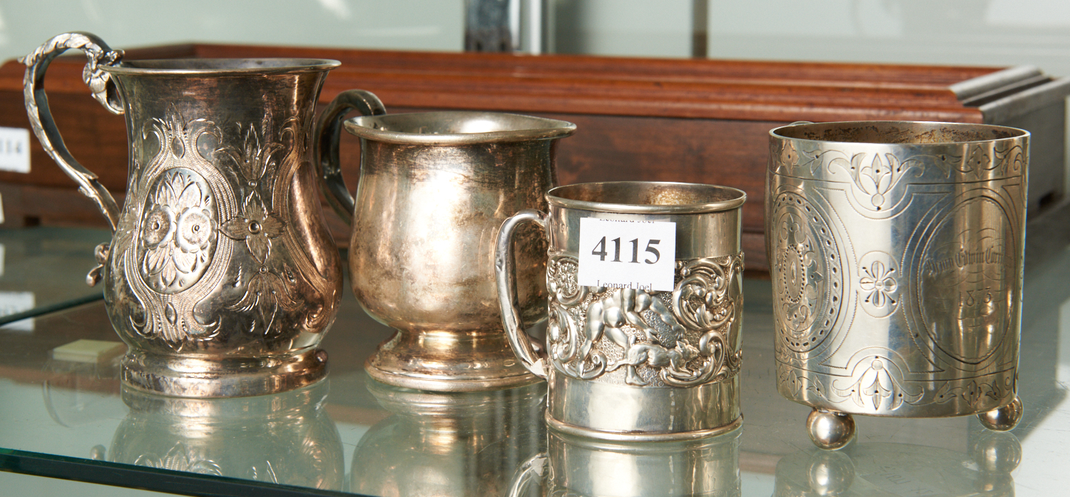 FOUR CHRISTENING MUGS, TWO IN STERLING SILVER AND TWO IN SILVER PLATE, INCLUDING ONE STERLING MUG INSCRIBED HENRY EDWIN CORRIGAN 1873 (AUS), THE LARGEST 7CM X 6CM X 6CM, LEONARD JOEL LOCAL DELIVERY SIZE: SMALL