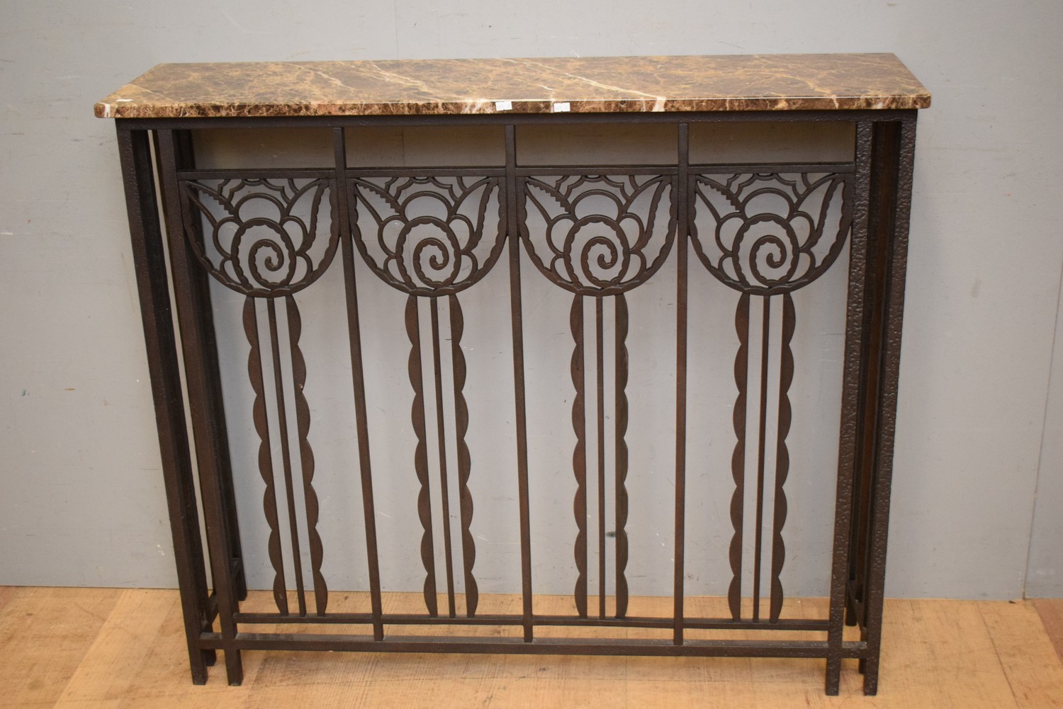 AN ART DECO STYLE IRON AND MARBLE CONSOLE (101H X 120W X 32D CM) (PLEASE NOTE THIS HEAVY ITEM MUST BE REMOVED BY CARRIERS AT THE CUSTOMER'S EXPENSE. LEONARD JOEL STAFF CANNOT ASSIST CARRYING THIS ITEM) (X-LARGE ITEM)
