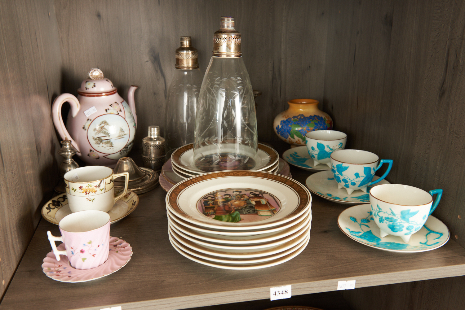 A SHELF OF ASSORTED ITEMS INCLUDING TEA WARE, KUTANI EXPORT COFFEE POT MARKED MAI, A SMALL ROYAL DOULTON SQUAT VASE, TWO FLORAL CHINA PLATES, A PAIR OF STORM SHADES (ALL FAULTS) AND A SET OF ROYAL COPENHAGEN HANS CHRISTIAN ANDERSEN PLATES. THE COFFEE POT 22CM HIGH, LEONARD JOEL LOCAL DELIVERY SIZE: SMALL