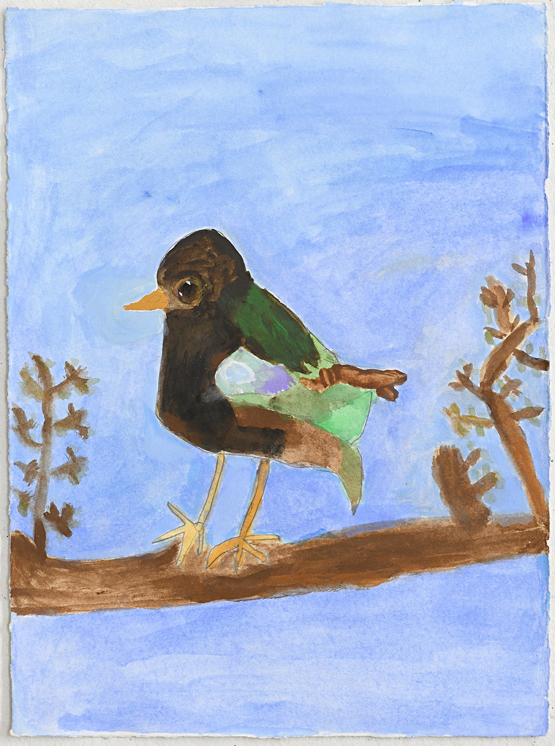 Museum Bird is a lovely example of Coburn's gentle application of media, the neatly composed work framing the subject against the clear blue sky.