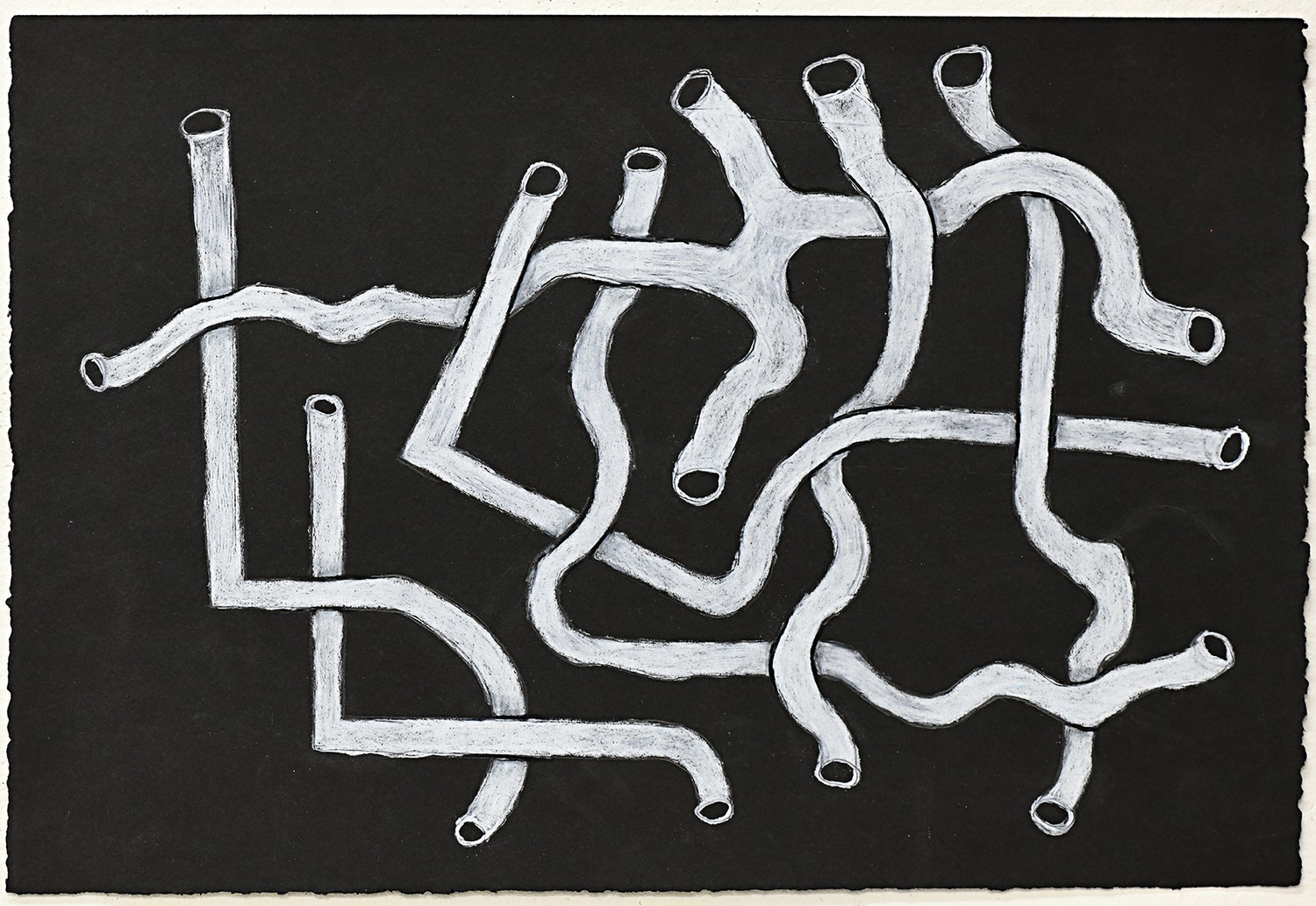 This piece is a fine example of Coomb's practice. Sculptural in form, the twisted piping is a striking graphic, gracefully woven and elegant in its composition.