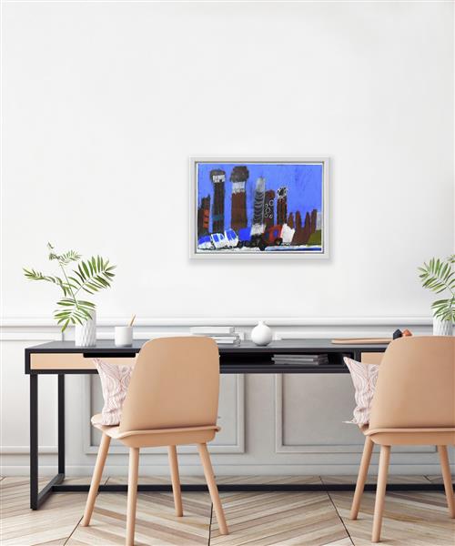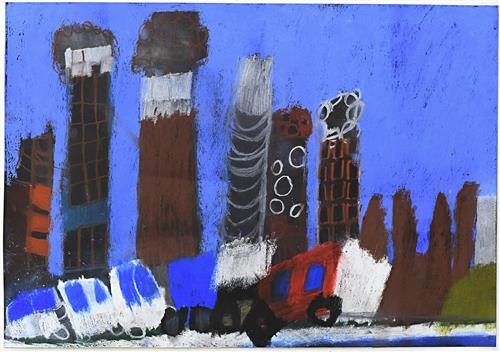 In Dawes' selected work the noise and smog of a large city seems to be captured in the application of pastel as we lay witness to what appears to be a collision of vehicles on the road on the foreground.