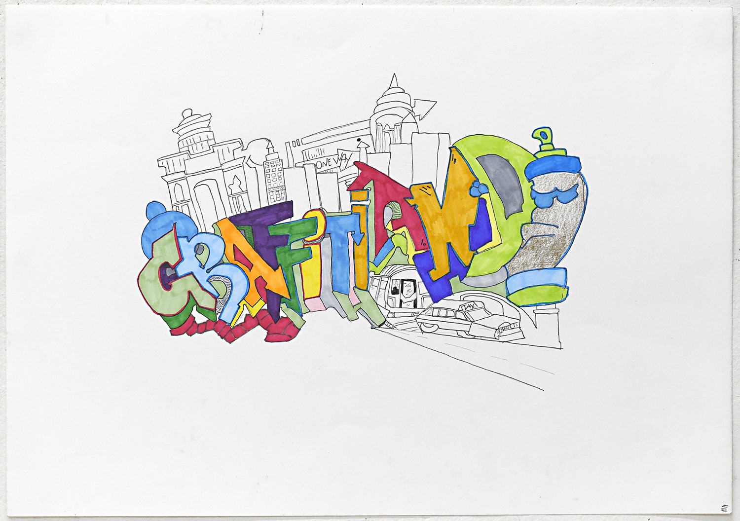 This work by Dearing pays homage to street art, the bright lettering in classic graffiti text emblazoned across the cityscape.