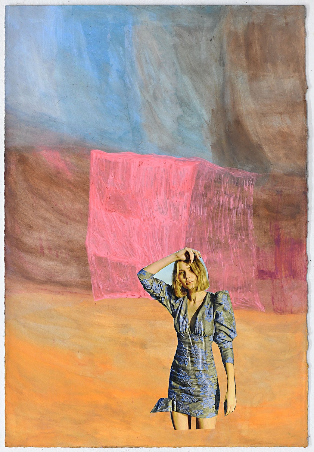 Untitled illustrates Dober's sensitivity to composition and space, the blocks of soft pastel tower beyond the figure, who appears to be standing thigh-deep in orange dust.