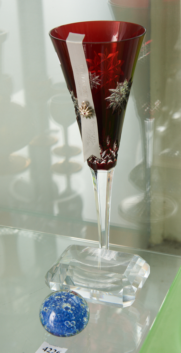 1ST EDITION, WATERFORD LEAD CRYSTAL SNOWFLAKE GLASS, 26cm x 7cm x 7cm, ALONG WITH TWO GLASS PAPERWEIGHTS. ONE CLEAR FACETED. ONE SPHERICAL BLUE, 5CM x 10CM x 5CM, LEONARD JOEL LOCAL DELIVERY SIZE: SMALL