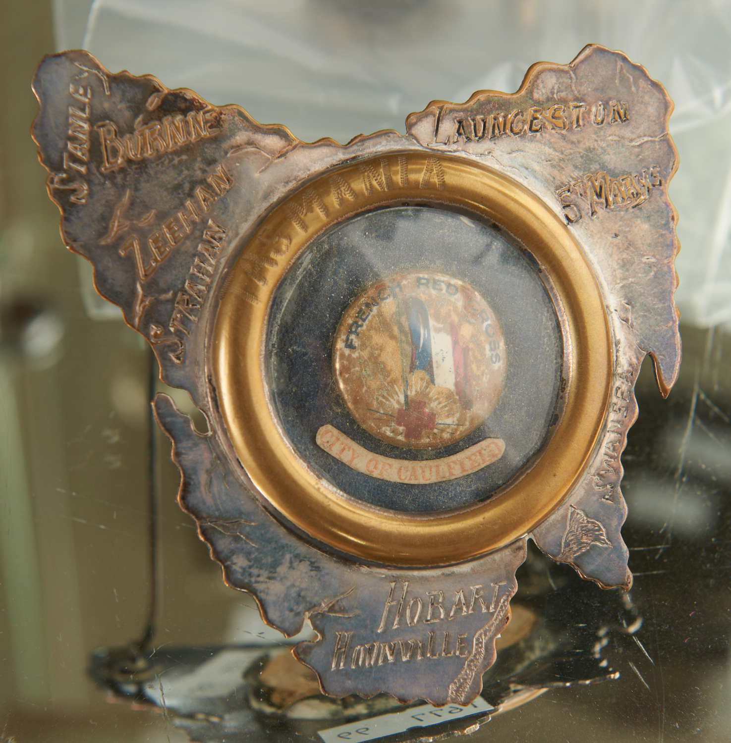A SMALL FRENCH RED CROSS BADGE, HOUSED IN A SILVER PLATE FRAME IN THE FORM OF TASMANIA. 9CM x 1CM x 1CM, LEONARD JOEL LOCAL DELIVERY SIZE: SMALL