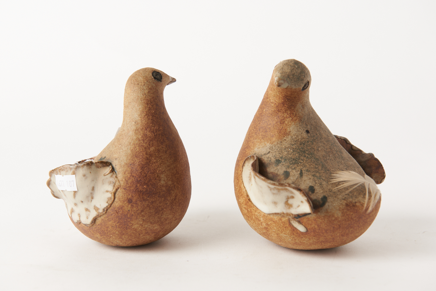 PAIR OF SYLVIA HALPERN POTTERY BIRDS WITH FEATHER TAILS. 14CM x 12CM x 12CM, LEONARD JOEL LOCAL DELIVERY SIZE: SMALL