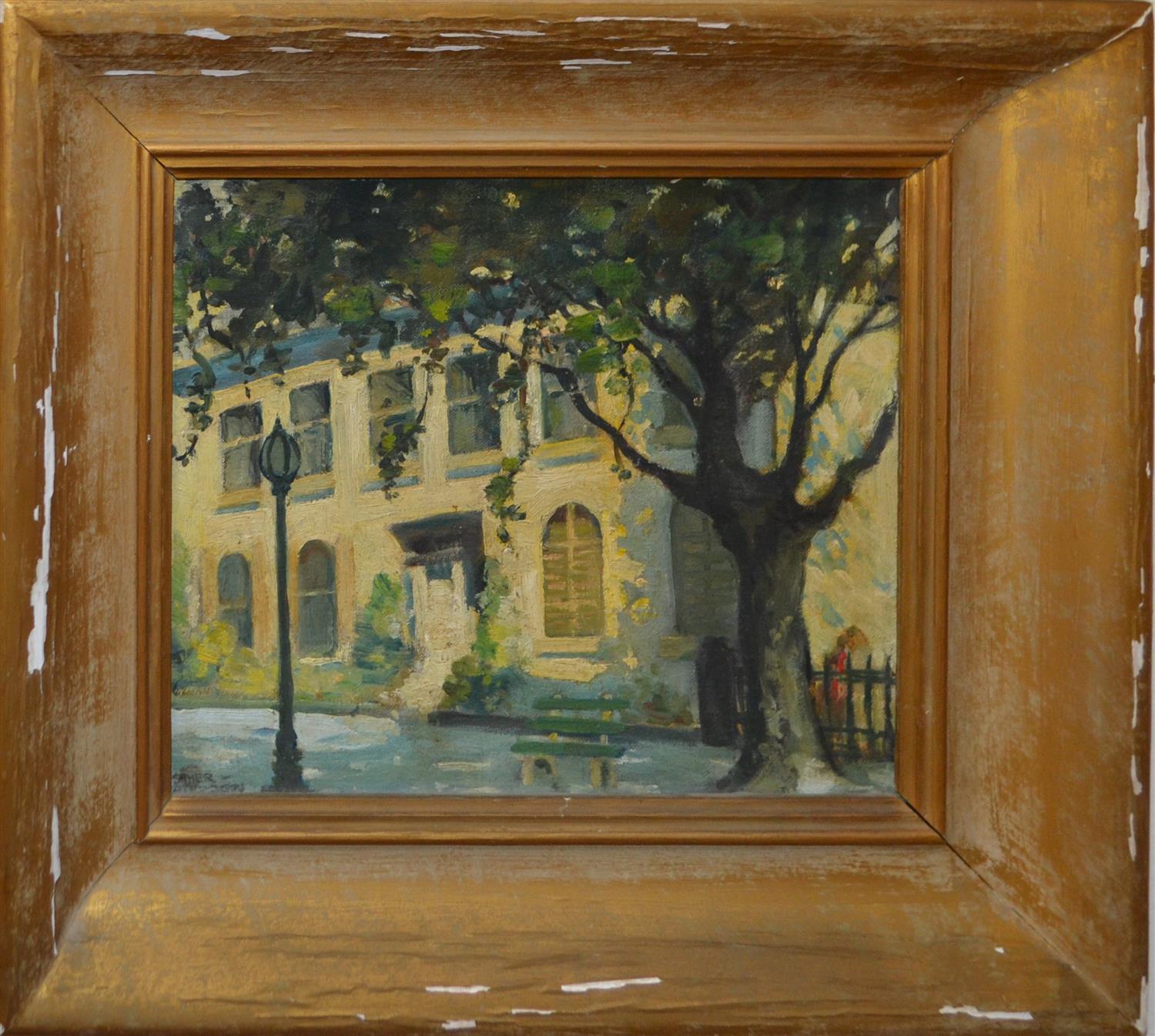 ESTHER PATERSON, STREET SCENE, OIL ON BOARD, SIGNED LEFT, 22 x 26CM, FRAME SIZE: 36 X 40CM, CONDITION: SURFACE DIRT, WARPING TO BOARD, STAIN OF SIGNATURE, LOSSES TO GOLD GILD OF FRAME, LEONARD JOEL DELIVERY SIZE: SMALL