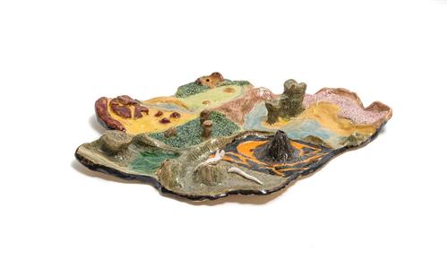 Grijalva's Old World of Different Regions reads like an ancient three-dimensional topographic map, the surface texture tactile and the glaze beautifully rendered.