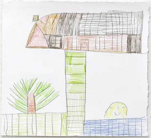 Untitled is a lovely example of Keen's practice, the sun shining on the smiling face of the character standing proudly beneath his treehouse.