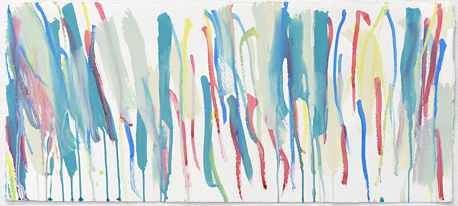 Ross O'Meara is an emerging artist working expressively with ink on paper. Utilising a landscape orientation for his work, he splashes brightly coloured ink across the page, which has the dynamism and seeming spontaneity of a Jackson Pollock painting.