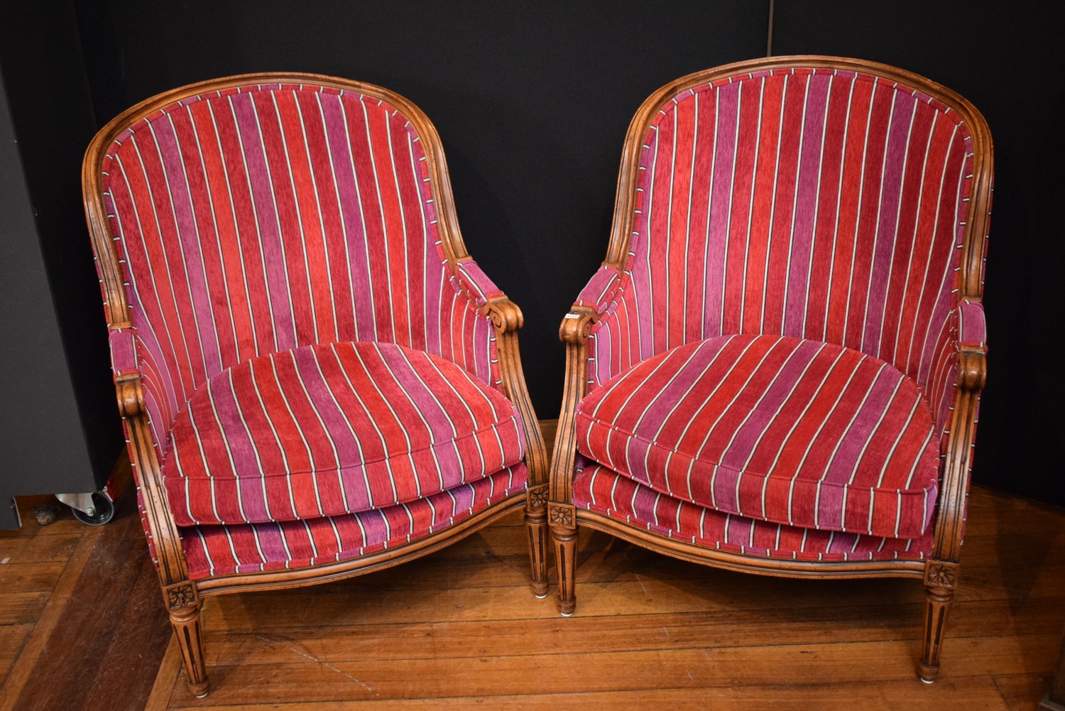A PAIR OF STRIPED BERGERES (97H x 77W x 83D CM) (LEONARD JOEL DELIVERY SIZE: LARGE)