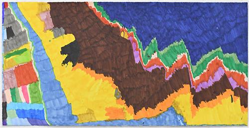 In Rebecca Scibilia's Japan Tokyo Trip, we see the artist reflecting on her experiences, the composition reading like an aerial mapping of a landscape and shoreline.