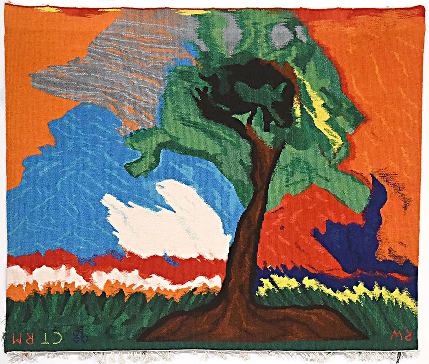 In 1996 Robin Warren received and invitation from the Victorian Tapestry Workshop to translate one of his paintings into a tapestry. The result is a beautifully rendered piece in rich, saturated colours, the wind torn tree set against a deep red sky.