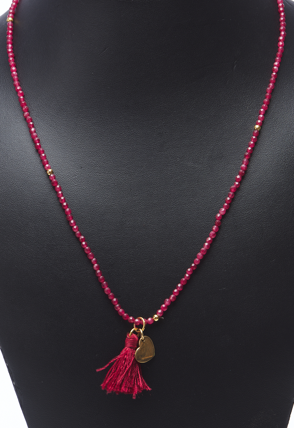 A FACETED RUBY BEAD NECKALCE WITH SILVER GILT CHARM AND SPACER BEADS, ELASTICISED