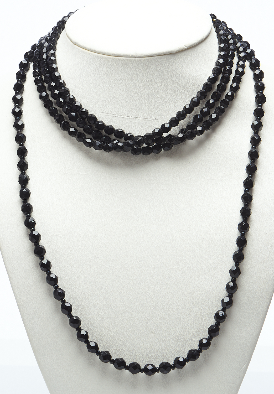 TWO ANTIQUE FRENCH JET NECKLACES, ONE TRIPLE STRAND ADJUSTABLE, THE OTHER 65CMS