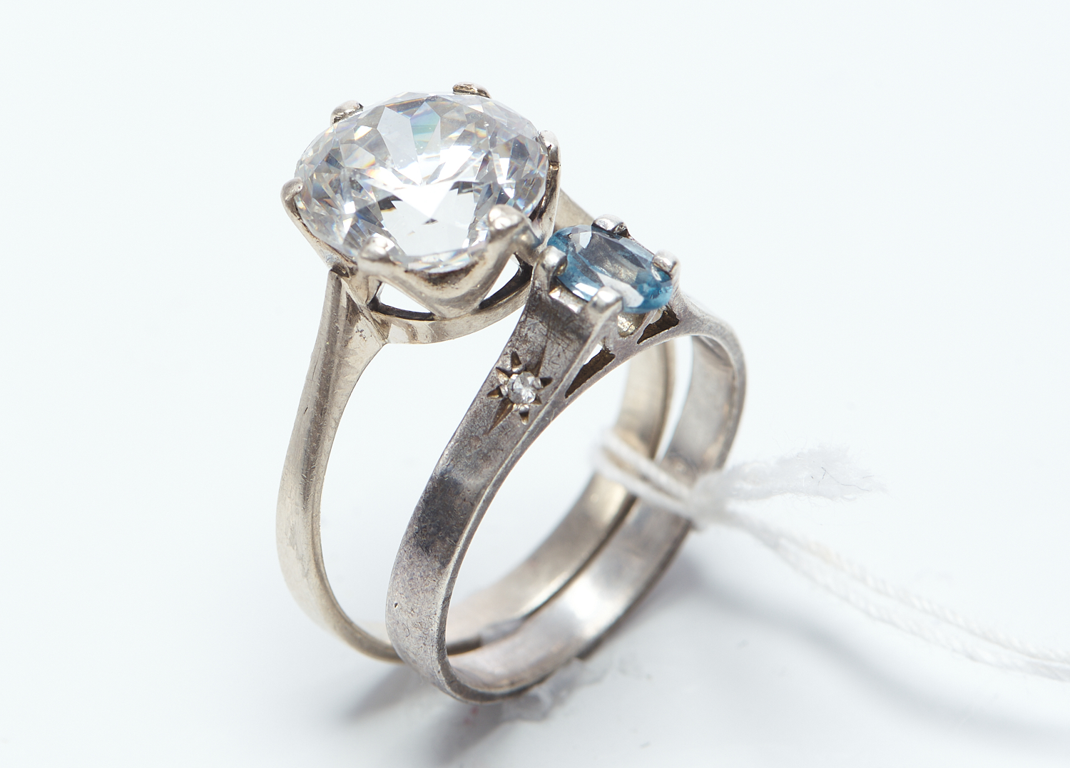 TWO RINGS INCLUDING AQUAMARINE AND CUBIC ZIRCONIA, ONE IN SILVER AND THE OTHER GOLD PLATED SILVER, SIZE P-Q AND N