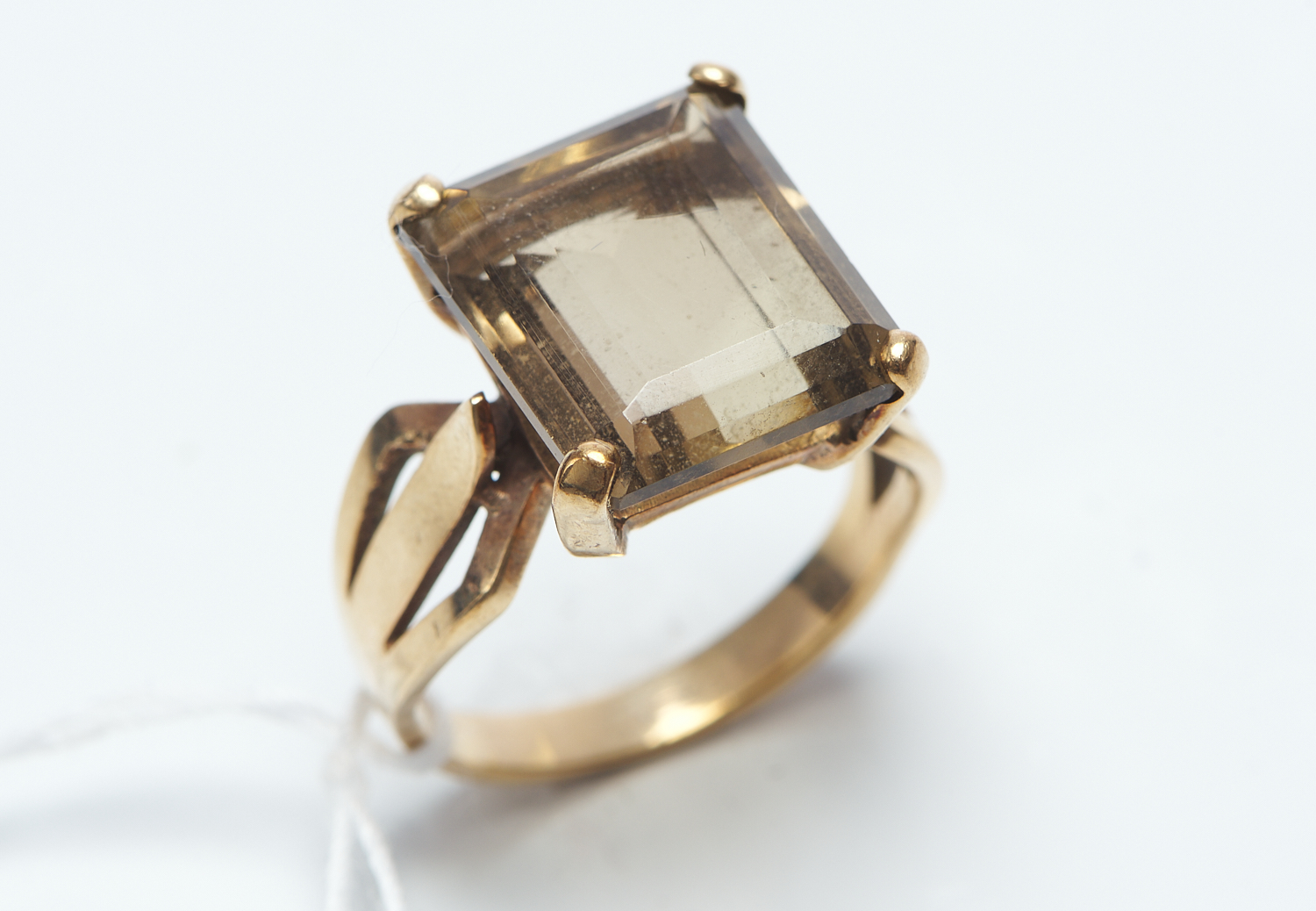 A VINTAGE SMOKEY QUARTZ RING IN 9CT GOLD, SIZE O, 5.4GMS
