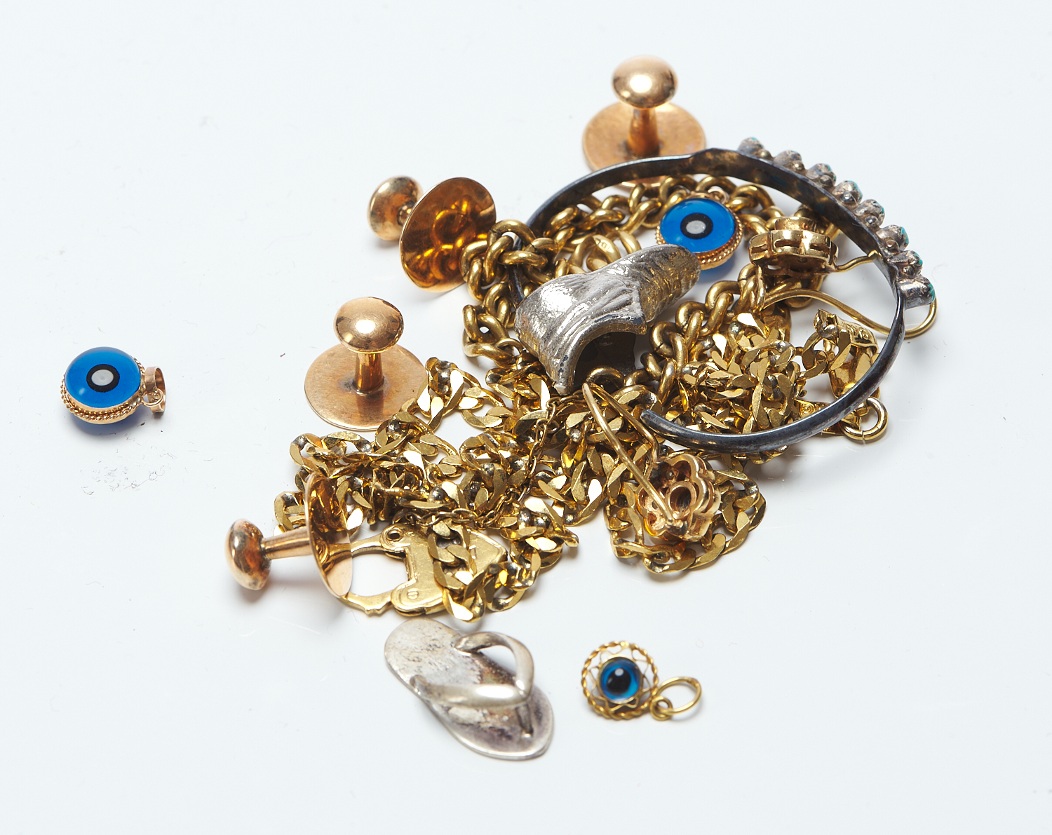 A COLLECTION OF JEWELLERY, FINDINGS AND SHIRT STUDS SOME IN 9CT GOLD