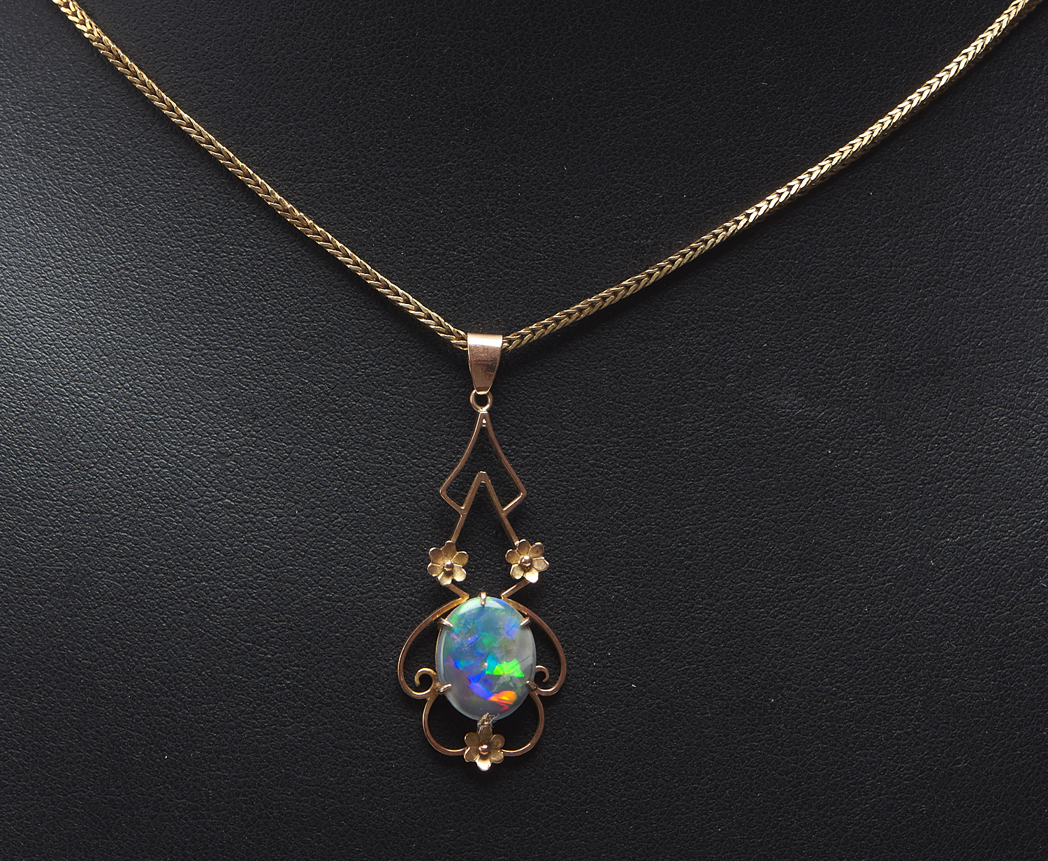 AN OPAL PENDANT AND CHAIN IN 9CT GOLD, LENGTH 320MM, 6.7GMS