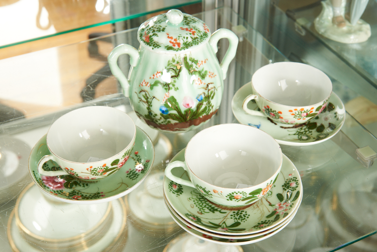 A SET OF CHINESE HAND PAINTED CUPS AND SAUCERS WITH LIDDED POT, LEONARD JOEL LOCAL DELIVERY SIZE: SMALL