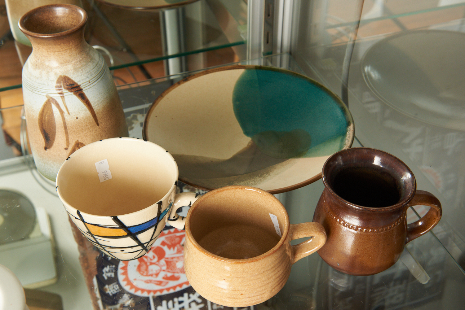 A GROUP OF AUSTRALIAN POTTERY COMPRISING ELSIE PASCOE SHALLOW BOWL (23 CM W), SIGNED GUMLEAF VASE (17 CM H), DAVID REDLER LARGE DECORATED CUP AND TWO BENDIGO POTTERY MUGS, LEONARD JOEL LOCAL DELIVERY SIZE: SMALL