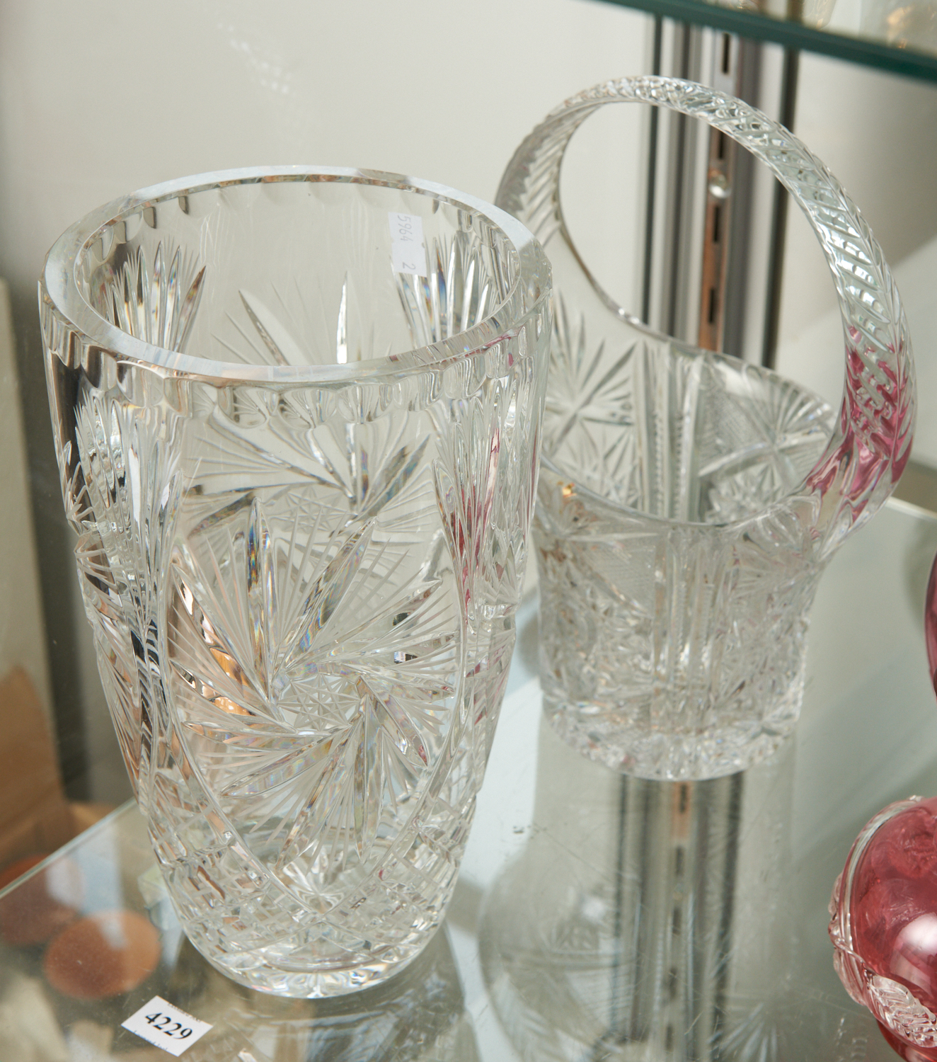 A HEAVY CUT CRYSTAL VASE AND A BASKET, LEONARD JOEL LOCAL DELIVERY SIZE: SMALL