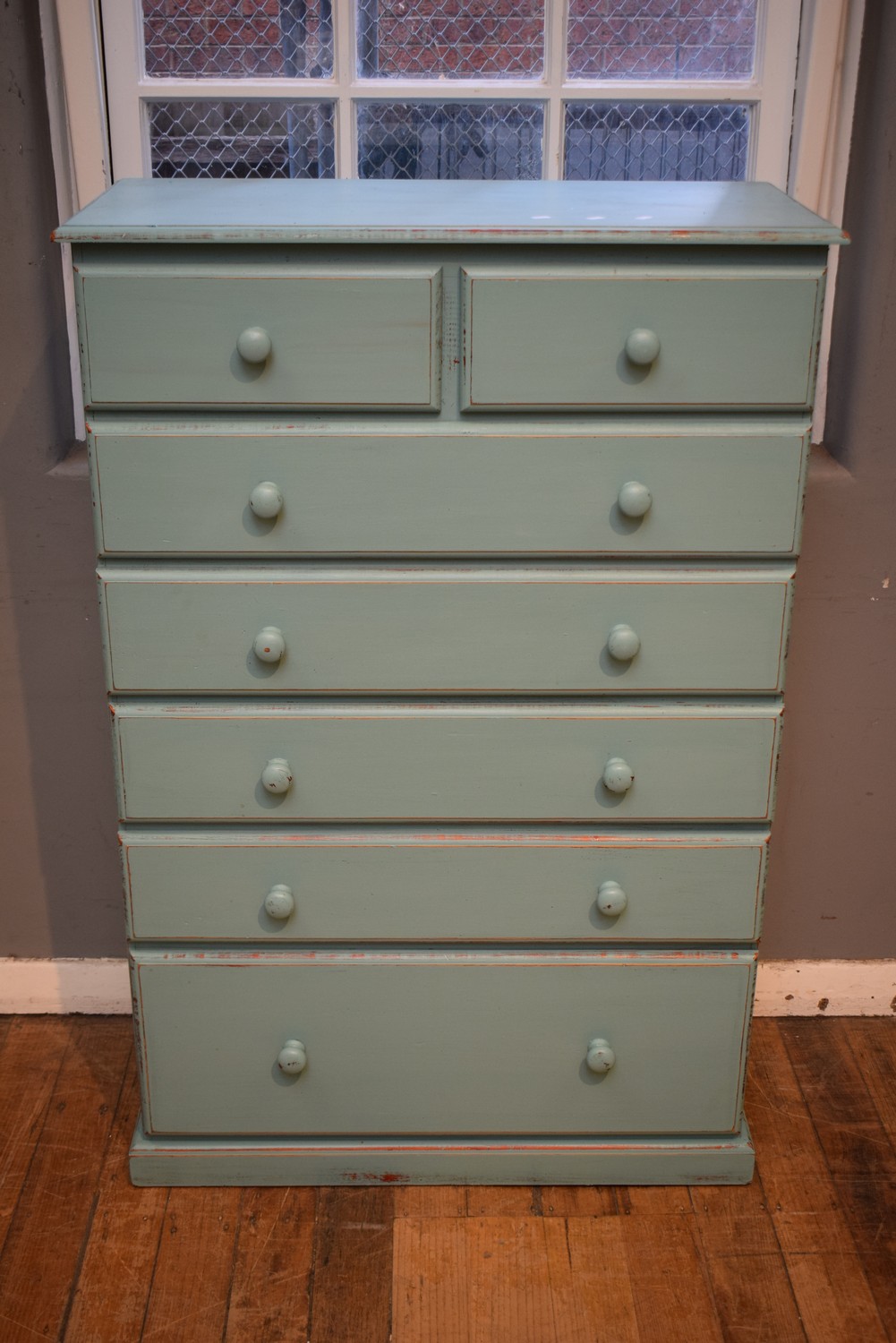 A BLUE PAINTED SEVEN DRAWER TALL BOY (H137 X W90 X D43 CM) (PLEASE NOTE THIS HEAVY ITEM MUST BE REMOVED BY CARRIERS AT THE CUSTOMER'S EXPENSE. LEONARD JOEL STAFF CANNOT ASSIST CARRYING THIS ITEM)