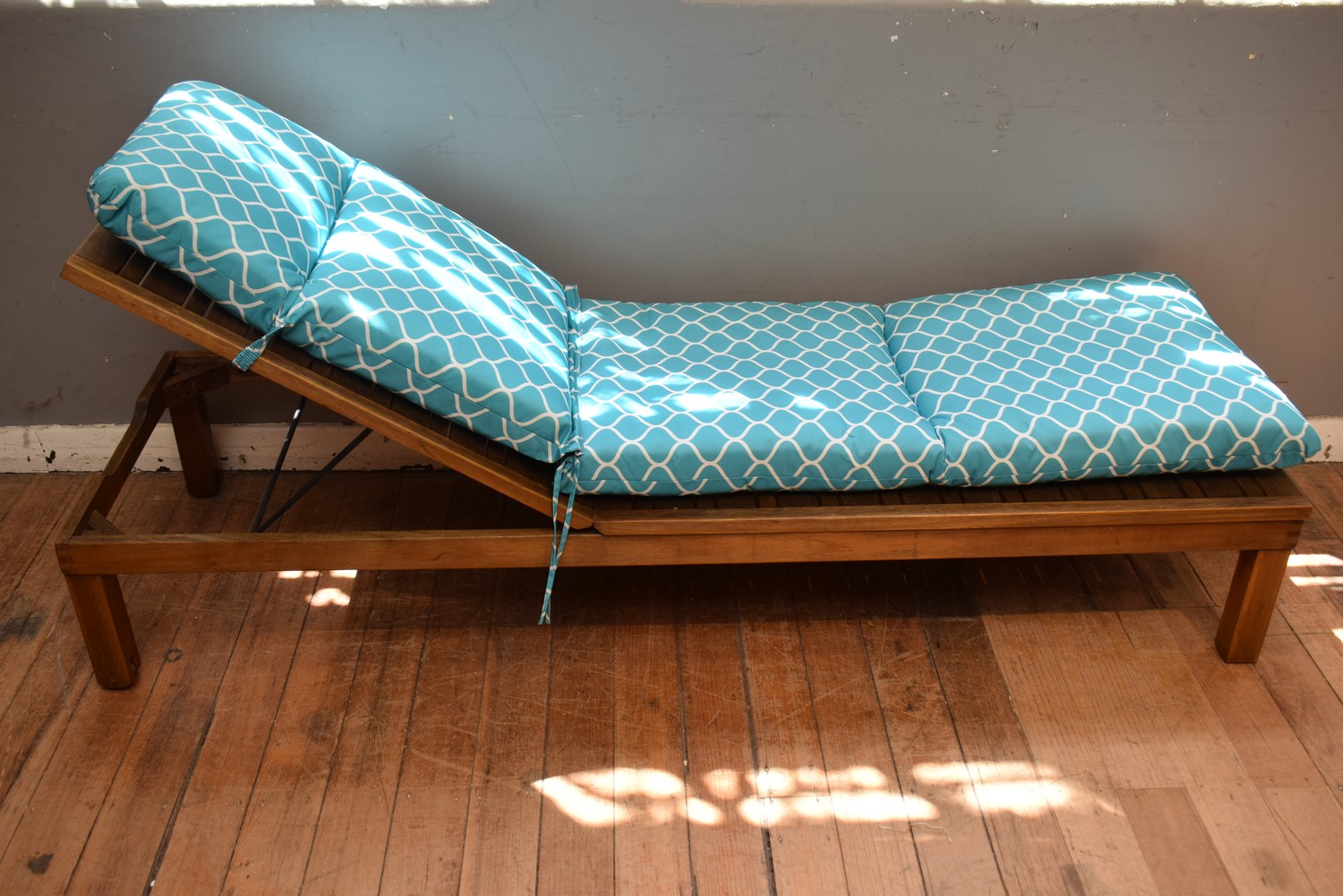 A TEAK SUN LOUNGE (H78 X W210 X D67 CM) (PLEASE NOTE THIS HEAVY ITEM MUST BE REMOVED BY CARRIERS AT THE CUSTOMER'S EXPENSE. LEONARD JOEL STAFF CANNOT ASSIST CARRYING THIS ITEM)