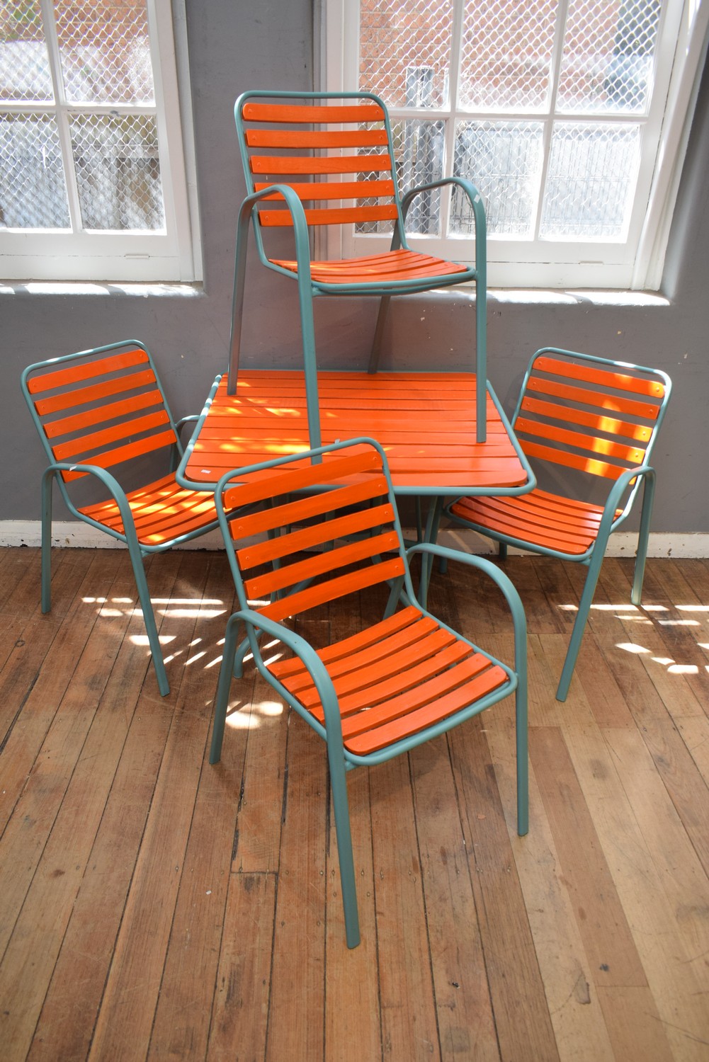 A PAINTED FIVE PIECE OUTDOOR SETTING (A/F) (H72 X W92 X D91 CM) (PLEASE NOTE THIS HEAVY ITEM MUST BE REMOVED BY CARRIERS AT THE CUSTOMER'S EXPENSE. LEONARD JOEL STAFF CANNOT ASSIST CARRYING THIS ITEM)