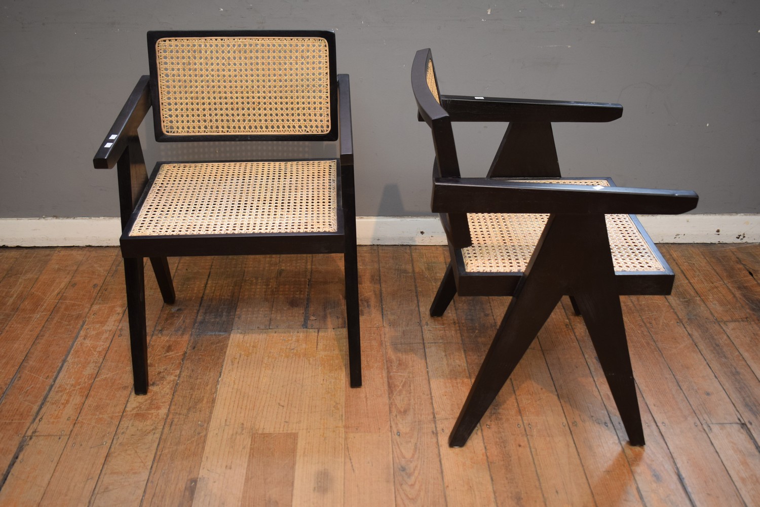 A PAIR OF TEAK AND RATTAN ACCENT CHAIRS (79H X 56W x 56D CM) (LEONARD JOEL DELIVERY SIZE: LARGE)