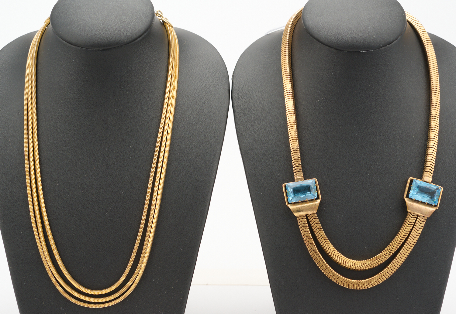 A RETRO PASTE SET COSTUME NECKLACE, TOGETHER WITH A TRIPLE STRAND GOLD TONE NECKLACE