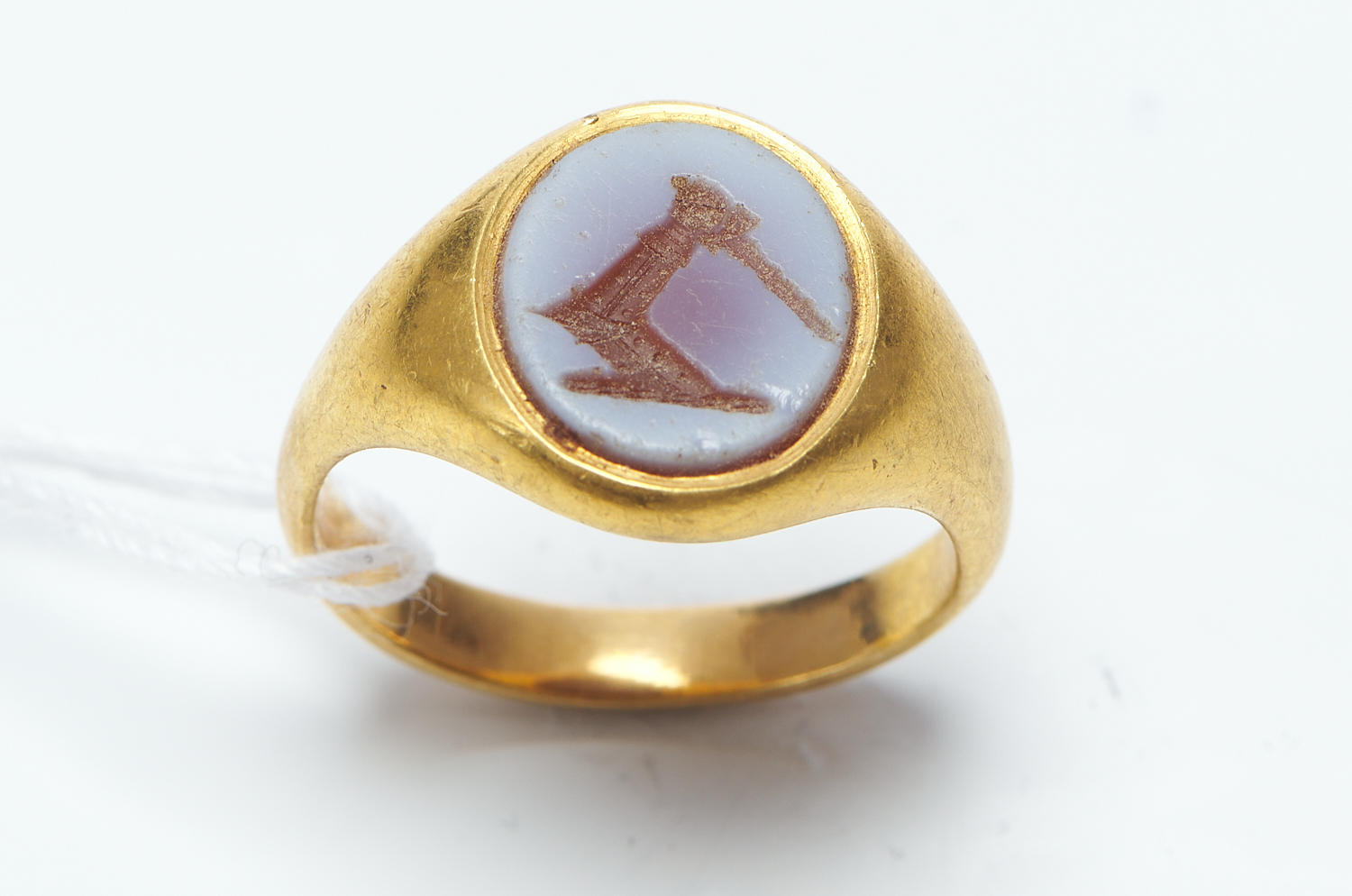 AN INTAGLIO RING IN 18CT GOLD FEATURING THE "PORTER" CLAN SYMBOL "VIGILANTIA ET VIRTUTE", SIZE K, 7.2GMS