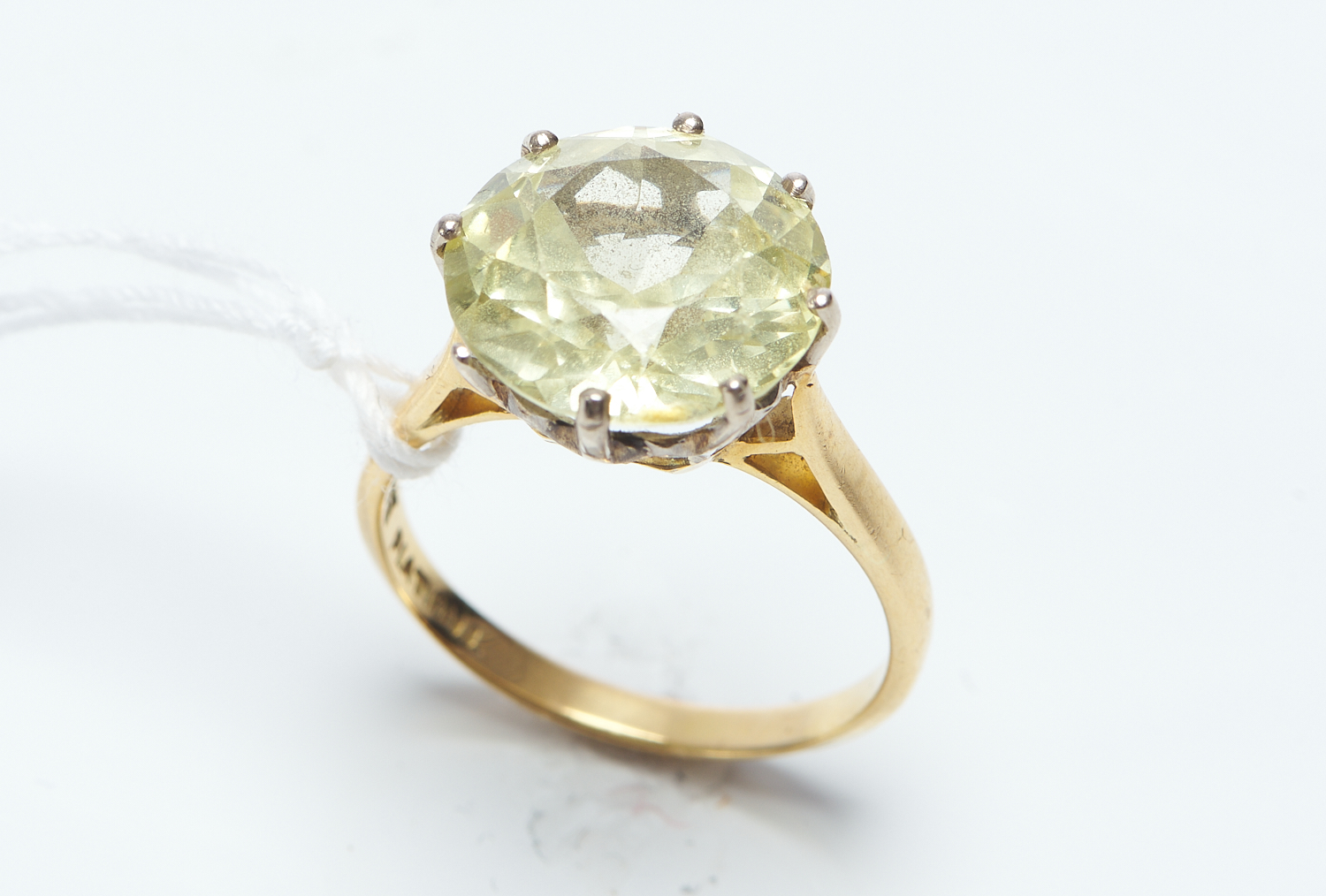 A LEMON QUARTZ DRESS RING IN 18CT GOLD, SIZE H, 3.7GMS