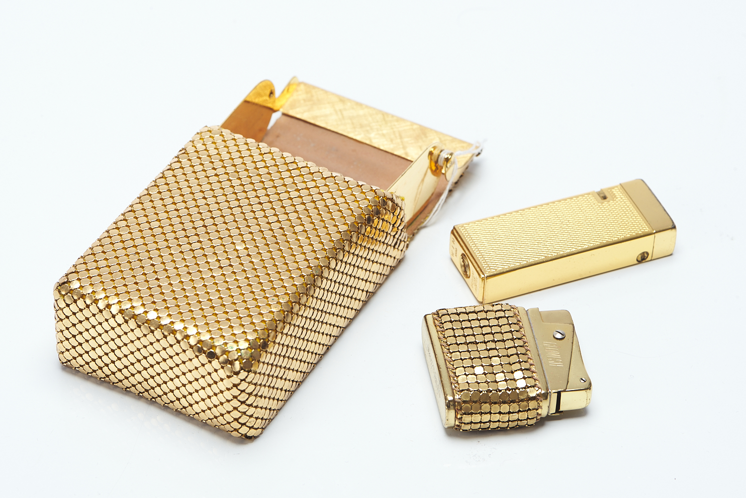 A GLOMESH CIGARETTE CASE AND LIGHTER AND A GOLD TONE LIGHTER
