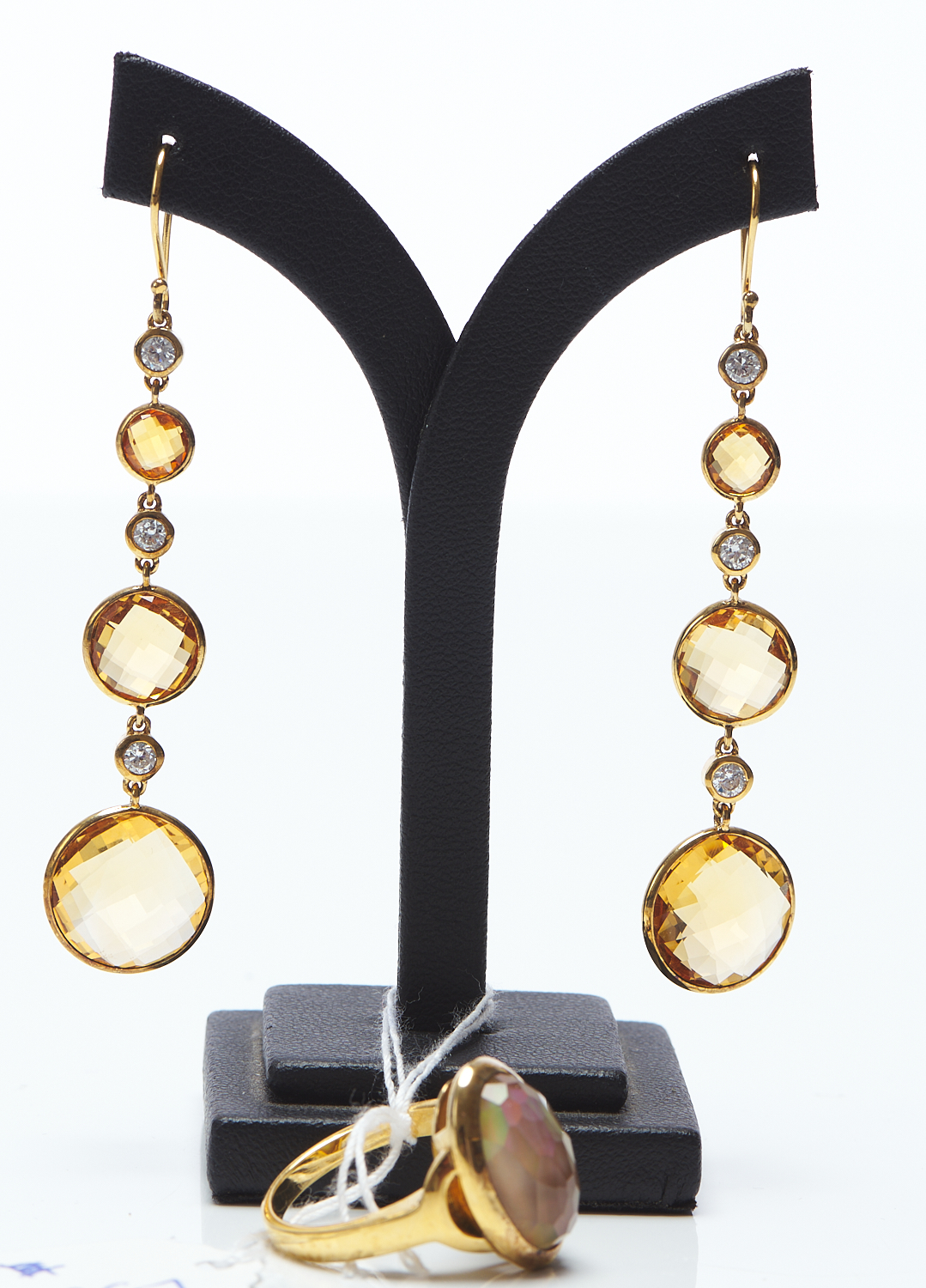 A PAIR OF CITRINE AND CUBIC ZIRCONIA DROP EARRINGS IN STERLING SILVER GILT WITH A 6CM DROP, TOGETHER WITH A CONFORMING RING (SIZE O-P)