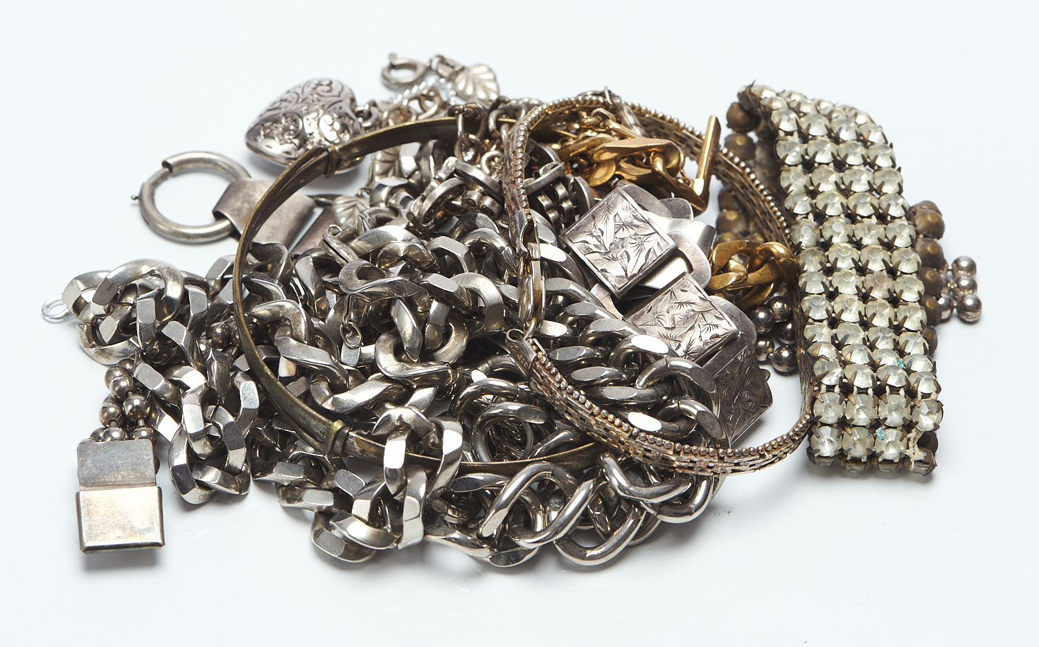 A COLLECTION OF BRACELETS/CHAINS INCLUDING 14CT GOLD, VICTORIAN ENGRAVED LINK, A/F