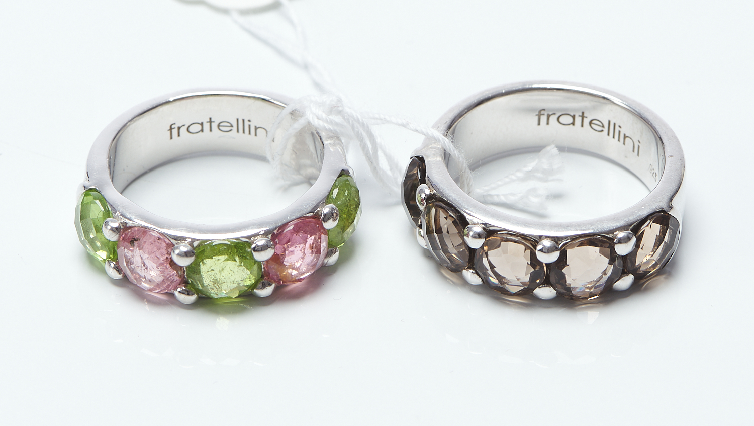 TWO GEM-SET RING IN STERLING SILVER, FEATURING PINK TOURMALINE, PERIDOT AND BROWN TOPAZ