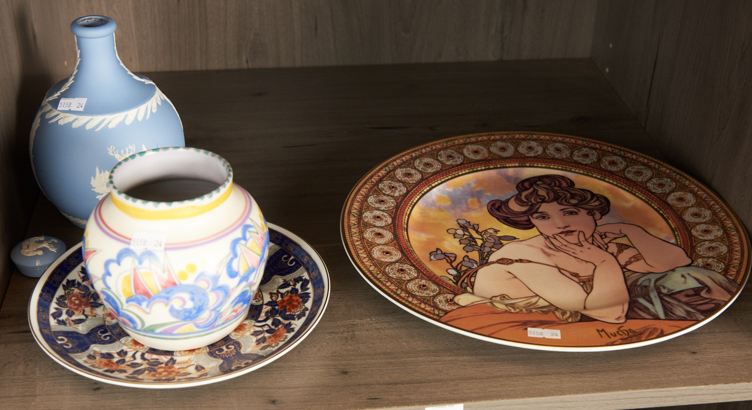 A POOLE VASE, A JASPERWARE BOTTLE WITH STOPPER (CORK IN STOPPER A/F), A GOEBLE 'MUCHA' LIMITED EDITION CHARGER AND A MODERN JAPANESE PLATE, LEONARD JOEL LOCAL DELIVERY SIZE: SMALL