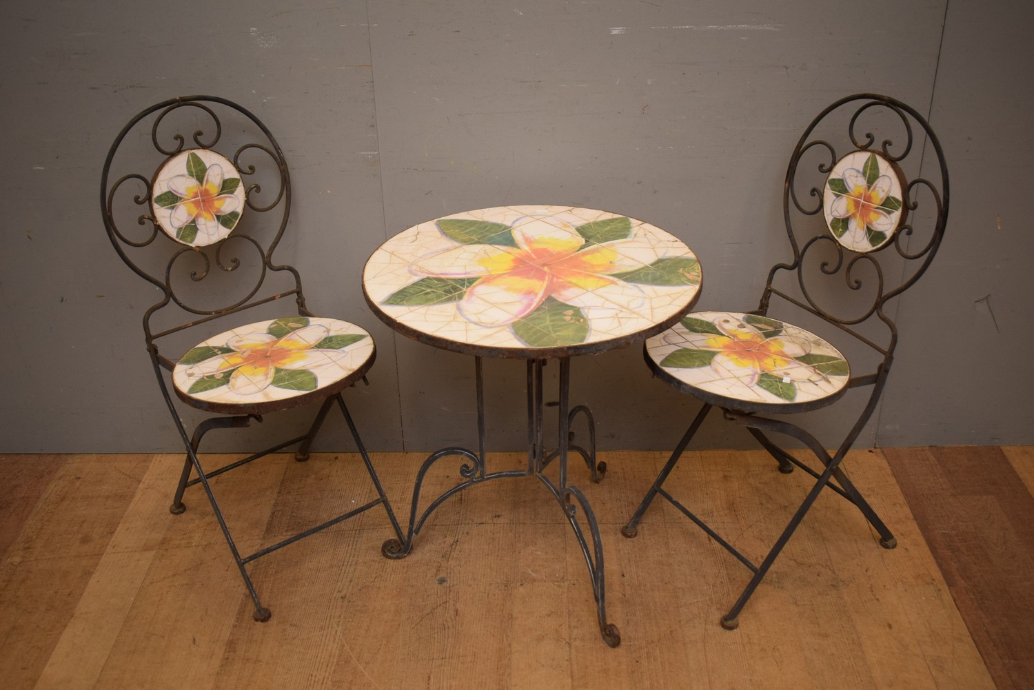 A THREE PIECE OUTDOOR SETTING WITH TILE DETAILING (A/F) ( 65H X 60 DIAMETER CM) (LEONARD JOEL DELIVERY SIZE: LARGE)