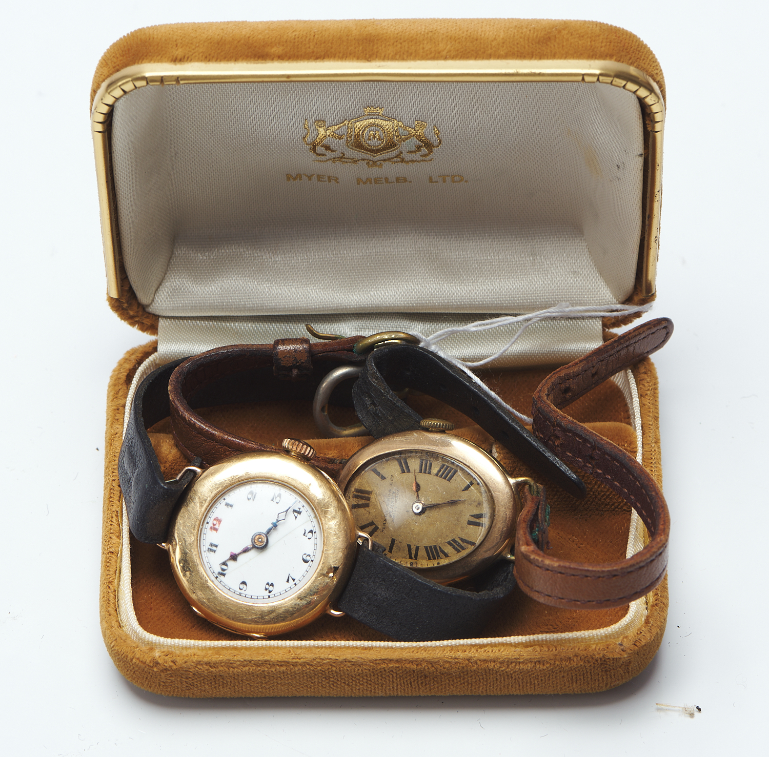 TWO ANTIQUE WATCHES IN GOLD CASE, MANUAL WIND, TO LEATHER BANDS, CIRCA 1924