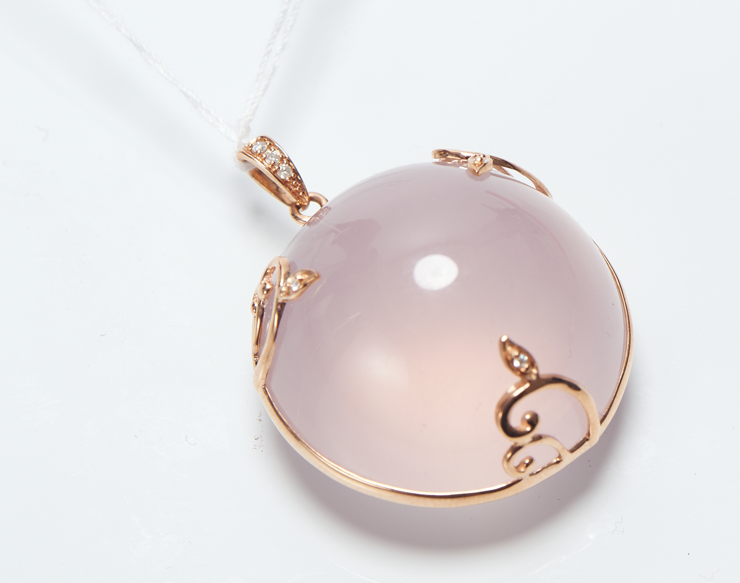 A LARGE ROSE QUARTZ AND DIAMOND PENDANT IN 9CT GOLD, THE ROSE QUARTZ WEIGHING 151.34CTS AND DIAMONDS TOTALLING 0.05CTS