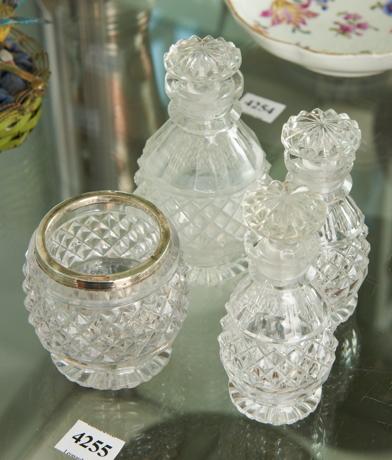 FOUR GEORGIAN CONDIMENT BOTTLES INCLUDING A MUSTARD POT WITH A SILVER RIM, (A/F), THE TALLEST 12 CM H, LEONARD JOEL LOCAL DELIVERY SIZE: SMALL