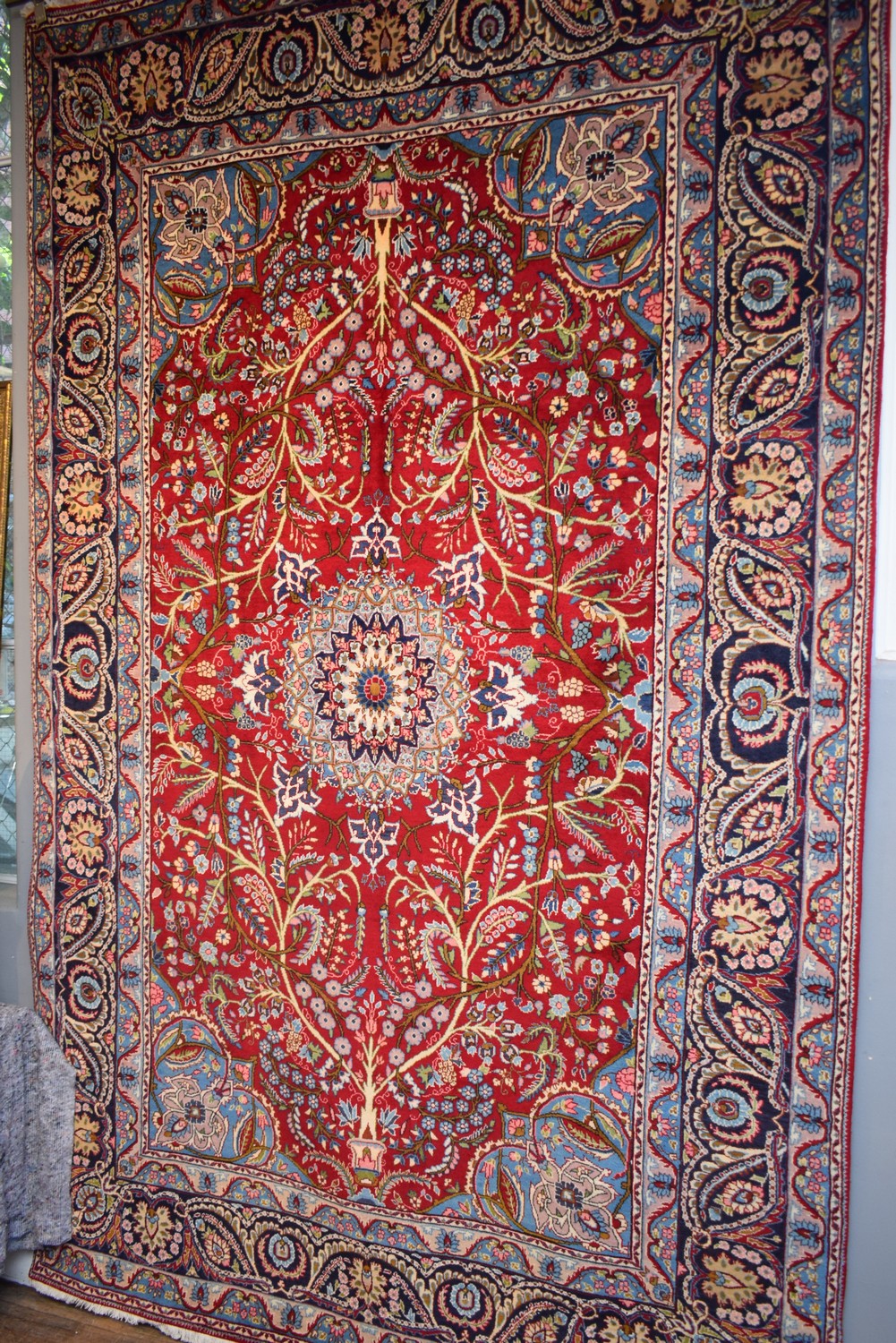A FINELY HAND-KNOTTED & RARE PERSIAN YAZD CARPET. 100% WOOL PILE. CITY WEAVE WITH RARE DESIGN OF SUNBURST FLORAL MEDALLION & QUARTERED CORNER MEDALLIONS IN A CRIMSON FIELD OF DOUBLE SYMMETRICAL TREES OF LIFE BEARING BLOSSOMING FLORAL SPRAYS. BORDER OF PALMETTES & FLORAL SPRAYS. STURDY & HARD-WEARING. GALLERY EXHIBITED. IN SUPERB CONDITION. CERTIFICATE OF AUTHENTICITY INCLUDED. SIZE: 310X200CM ORIGIN: PERSIA - RRP: $6,900