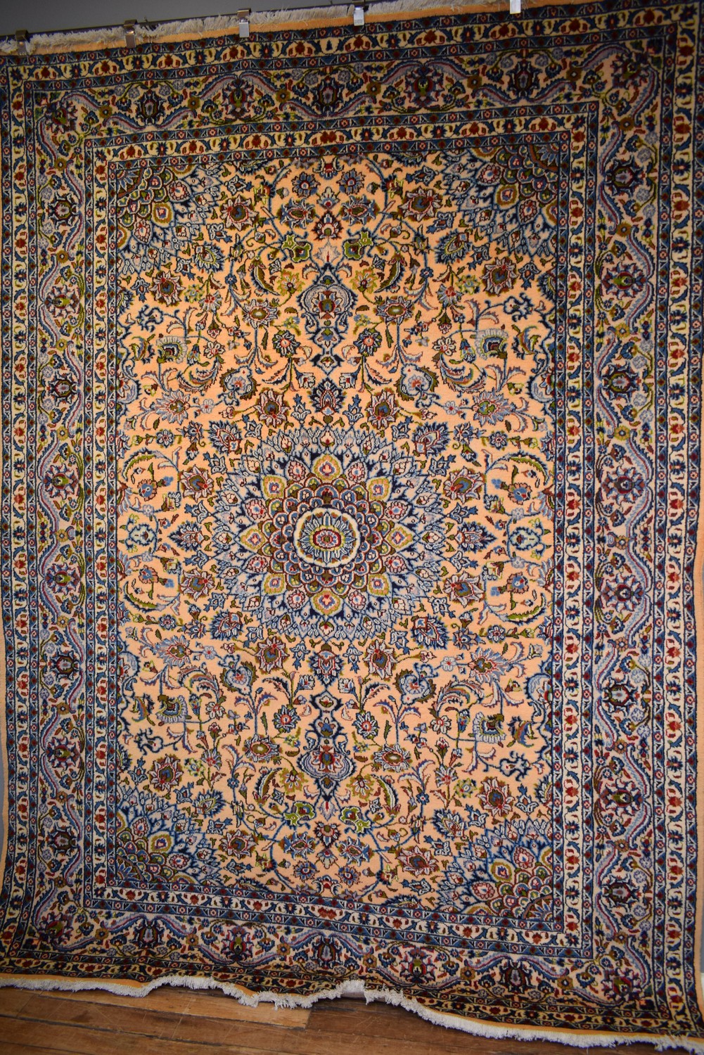 A PERSIAN KASHMAR CARPET. 100% WOOL. SOLID & DENSE PILE. HAND-KNOTTED AND WITH KASHMAR DESIGN OF SUNBURST MEDALLION OF PALMETTES & QUARTERED CORNER MEDALLIONS IN A FIELD OF SHAH ABBASSI PALMETTES, SAZ LEAVES & TENDRILS. MAJOR BORDER OF PALMETTES, FLORAL MOTIFS & ELONGATED TENDRILS. GALLERY IVENTORY. IN EXCELLENT CONDITION. SIZE: 340X250CM ORIGIN: KHORASAN/IRAN - RRP: $4,900