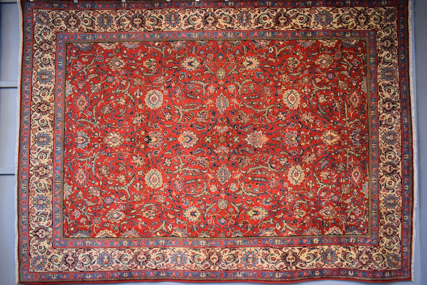 A CIRCA 1970s PERSIAN SAROUQ CARPET, 100% WOOL. HAND-KNOTTED CIITY WEAVE WITH CLASSIC SAROUQ DESIGN OF ALL-OVER BOLD PALMETTES, FLORAL MOTIFS & SAZ LEAVES IN A RED FIELD. MAJOR BORDER OF PALMETTES & TENDRILS. MINOR BORDERS OF FLOWER HEADS. EX-GALLERY INVENTORY. FULLY RESTORED & IN EXCELLENT CONDITION. CERTIFICATE OF AUTHENTICITY INCLUDED. SIZE: 360X260CM ORIGIN: PERSIA - RRP: $5,900