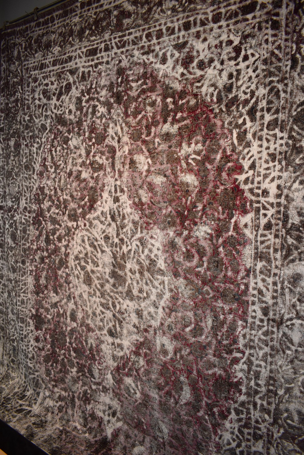 A CONTEMPORARY VINTAGE OVER-DYED PERSIAN TABRIZ CARPET. VINTAGE PILE. A UNIQUE & INDIVIDUAL MODERN CARPET CREATED FROM AN AUTHENTIC FINELY HAND-KNOTTED VINTAGE PERSIAN TABRIZ CARPET WITH CLASSIC MEDALLION DESIGN. THE PILE IS SHORN AND THE ENTIRE IS OVER-DYED IN CREAM, BURGUNDY & CHARCOAL TONES. GALLERY EXHIBITED. CERTIFICATE OF AUTHENTICITY INCLUDED. SIZE: 400X295CM ORIGIN: PERSIA - RRP: $7,900