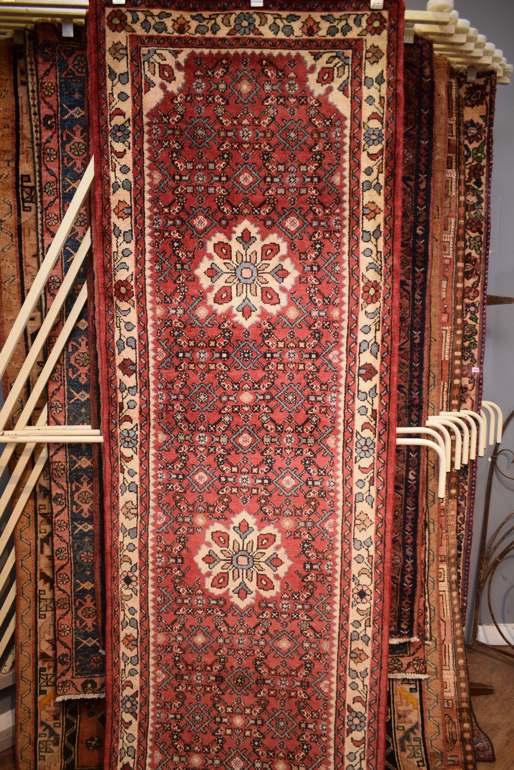 A PERSIAN ENJELAS HALL RUNNER. 100% WOOL. DENSE PILE. HAND-KNOTTED VILLAGE WEAVE FROM THE HAMADAN REGION WITH TRIBAL DESIGN OF REPEATING FLORAL MEDALLION IN A RED FIELD OF BOLD HERATI MAHI PATTERN. BORDER OF FLOWER HEADS & TENDRILS. SOLID & HARD-WEARING. EX-GALLERY STOCK. IN EXCELLENT CONDITION. CERTIFICATE OF AUTHENTICITY INCLUDED. SIZE: 390X85CM ORIGIN: PERSIA - RRP: $3,300